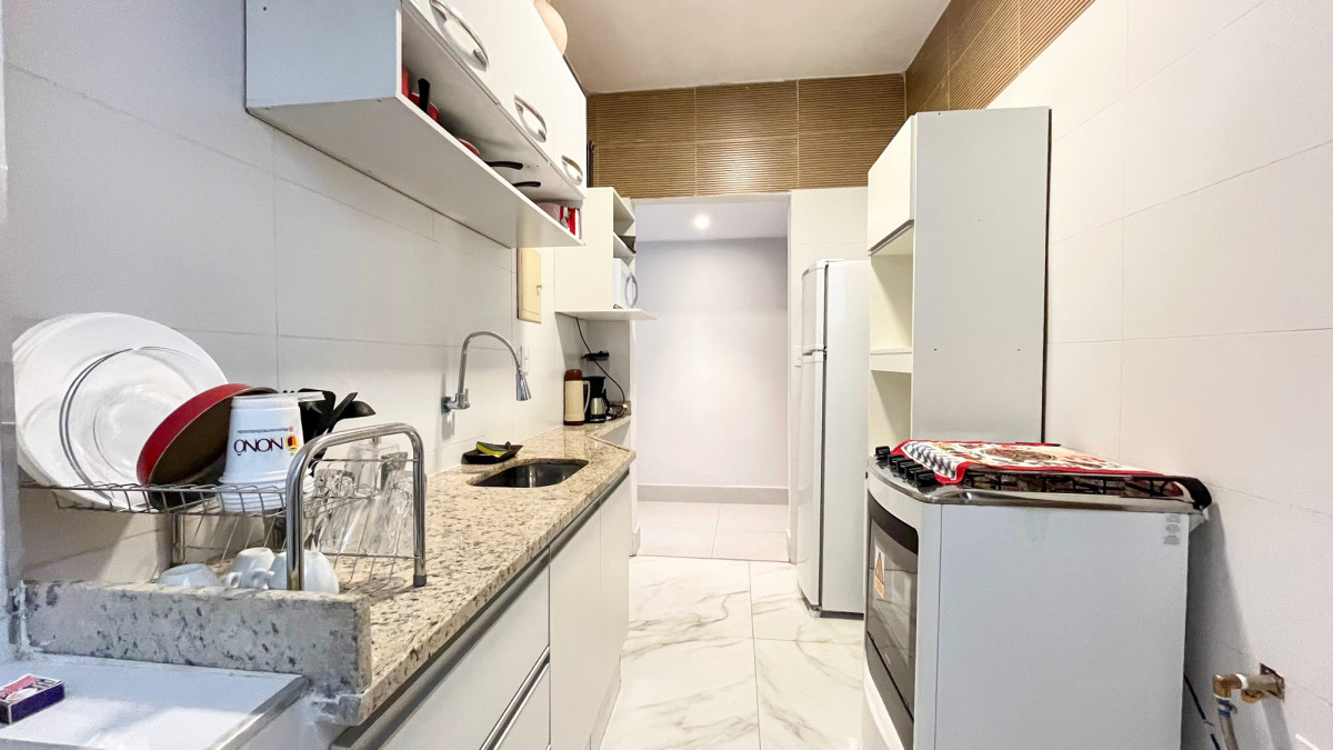Cozinha funcional, equipada com armários planejados, bancada em mármore e piso em porcelanato.