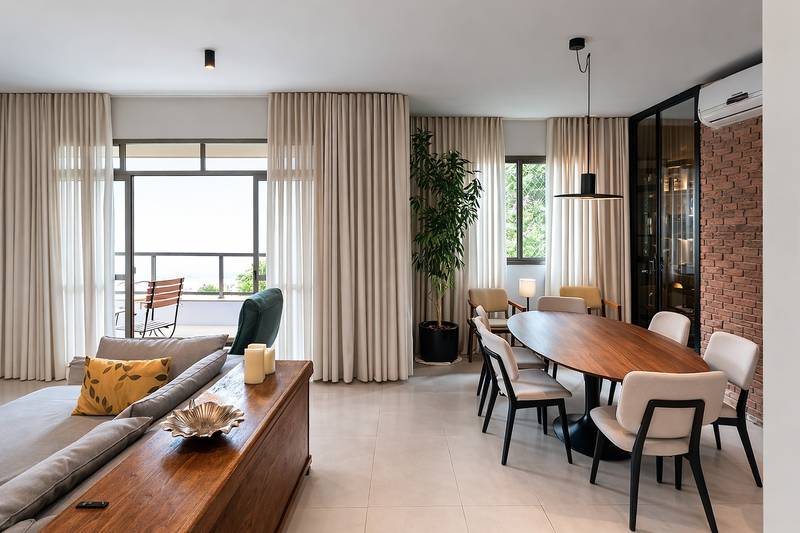 Sala para 02 ambientes, com piso em porcelanato, teto em gesso, projeto de iluminação da A de Arte, ar-condicionado, adega e varanda integrada.