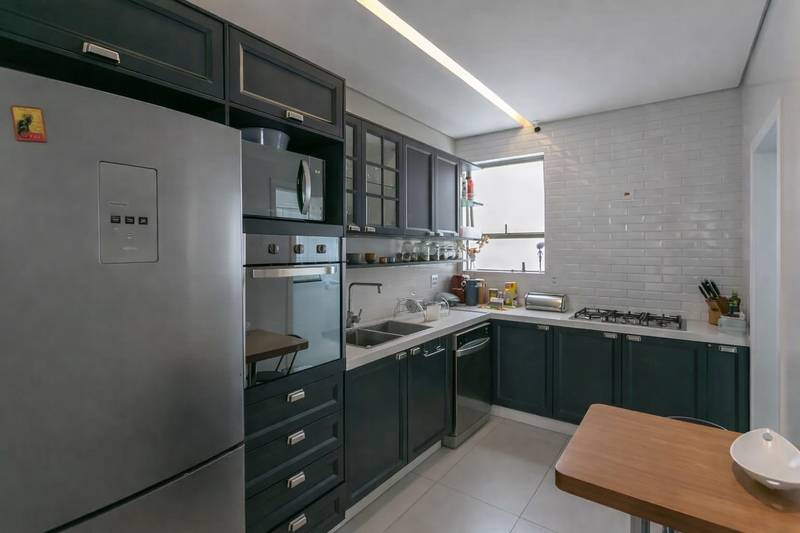 Cozinha com armários planejados, bancada em nanoglass, piso em porcelanato e despensa.