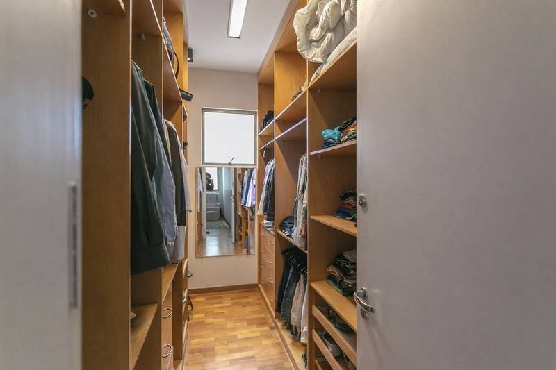 Banheiros (social e suíte) com box em blindex, armários e espelhos.
