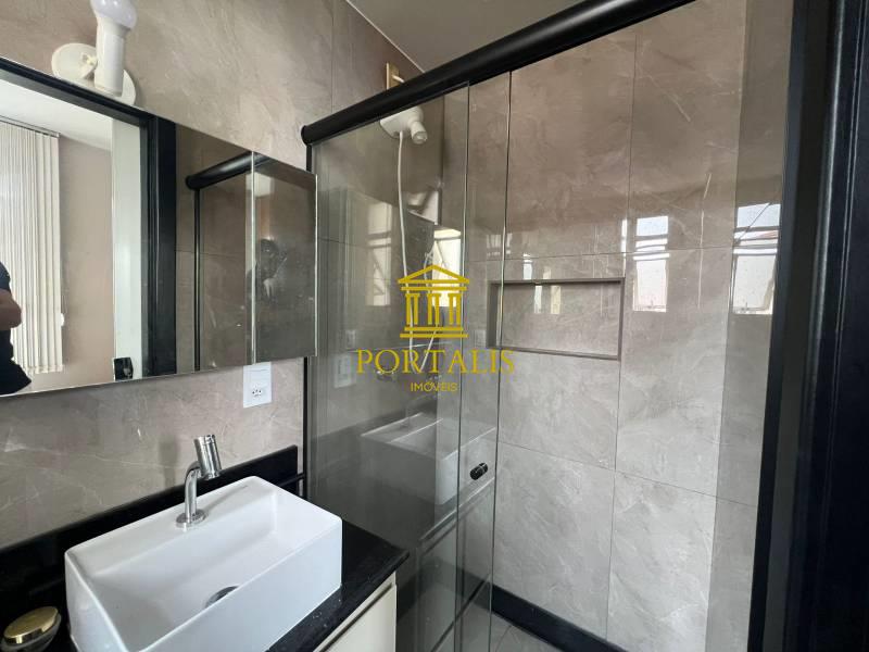 Banheiros (social e suíte) com armários e box em blindex