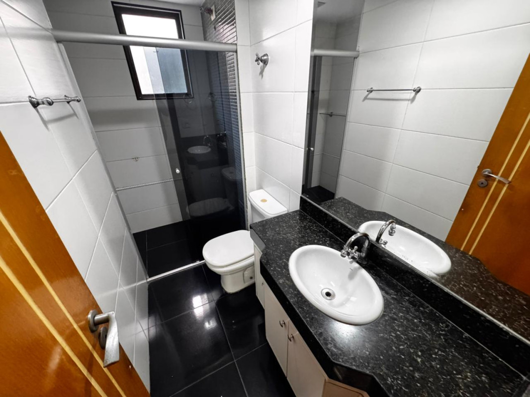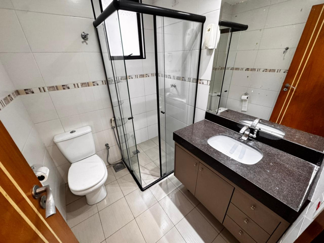 Banheiro socia e suítel com bancada em granito, armário, espelho e box em blindex