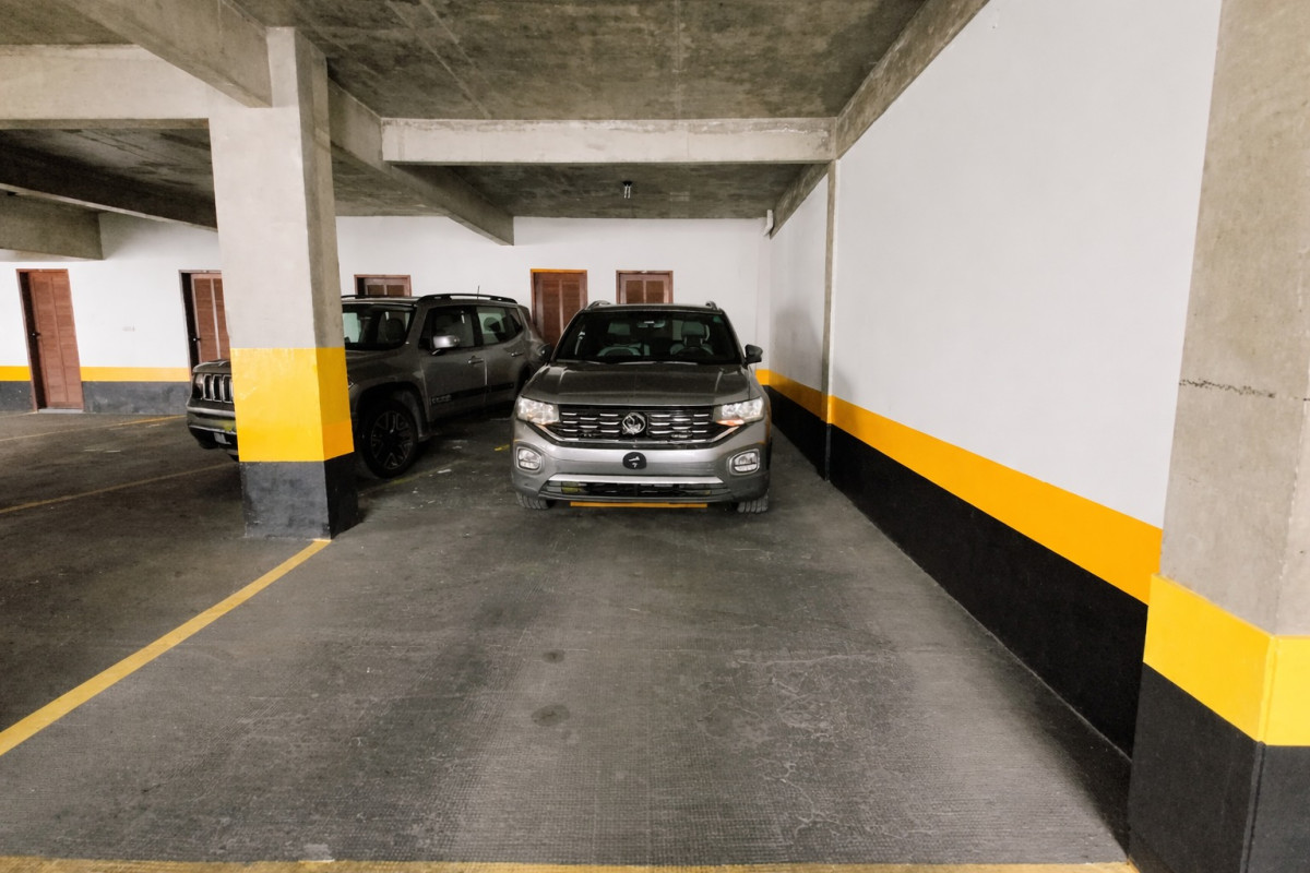 02 vagas de garagem em linha, cobertas e demarcadas.