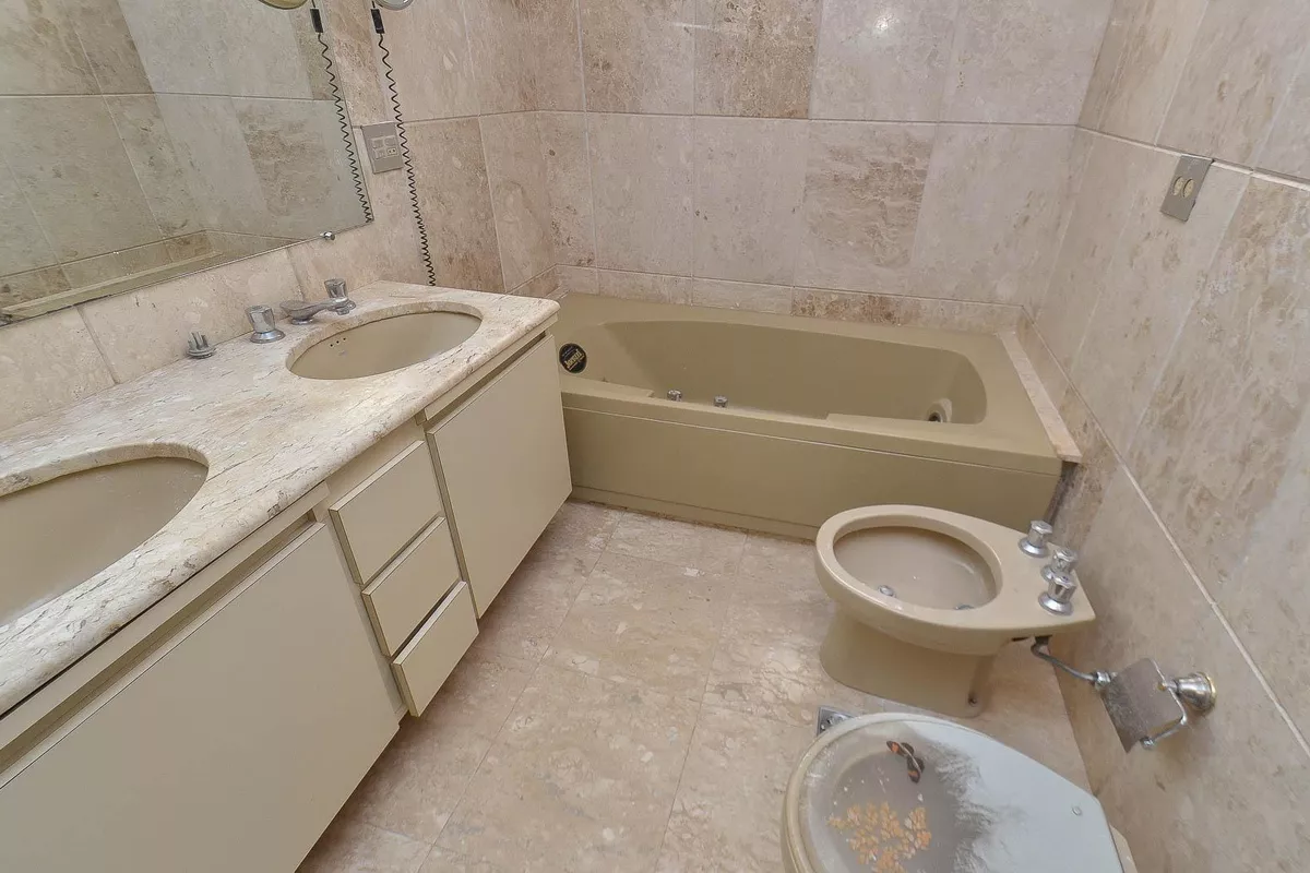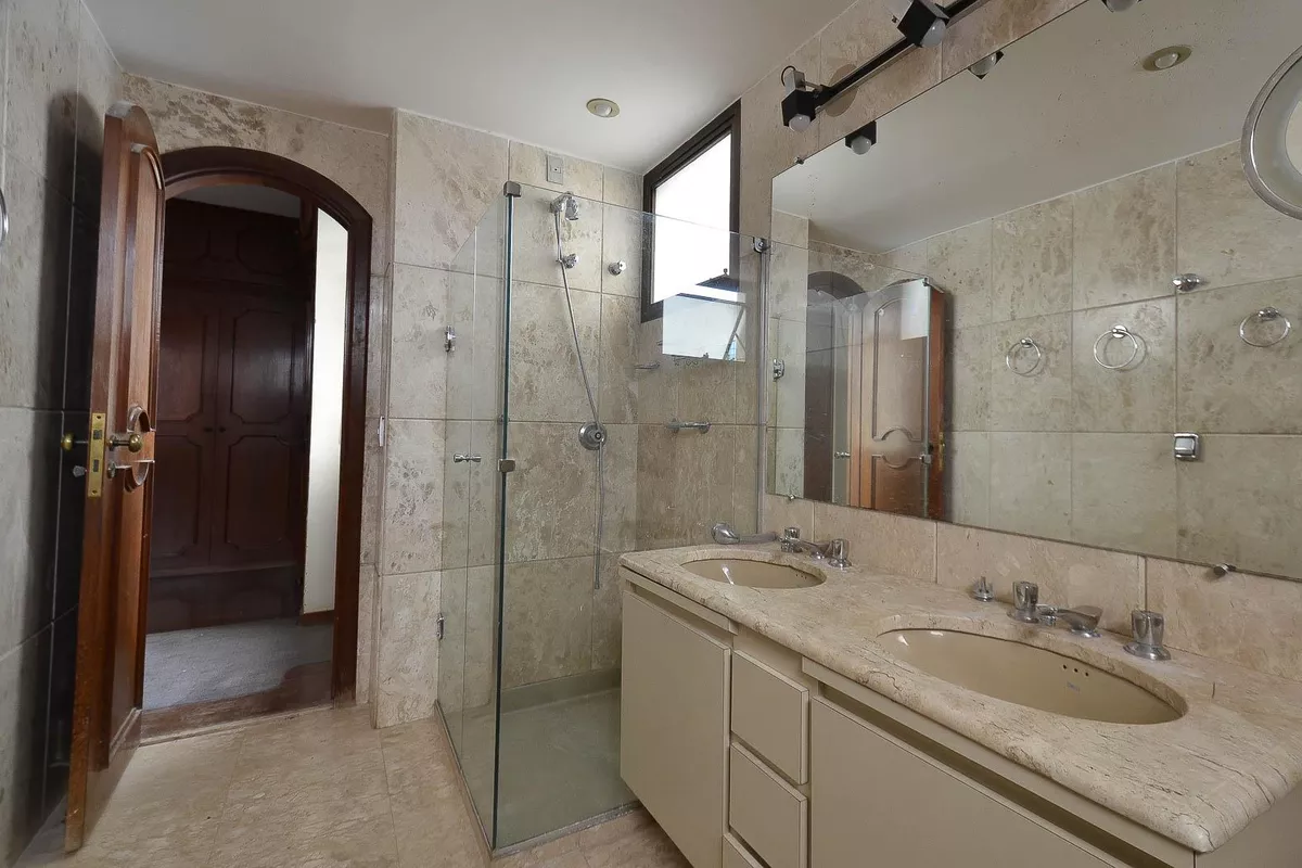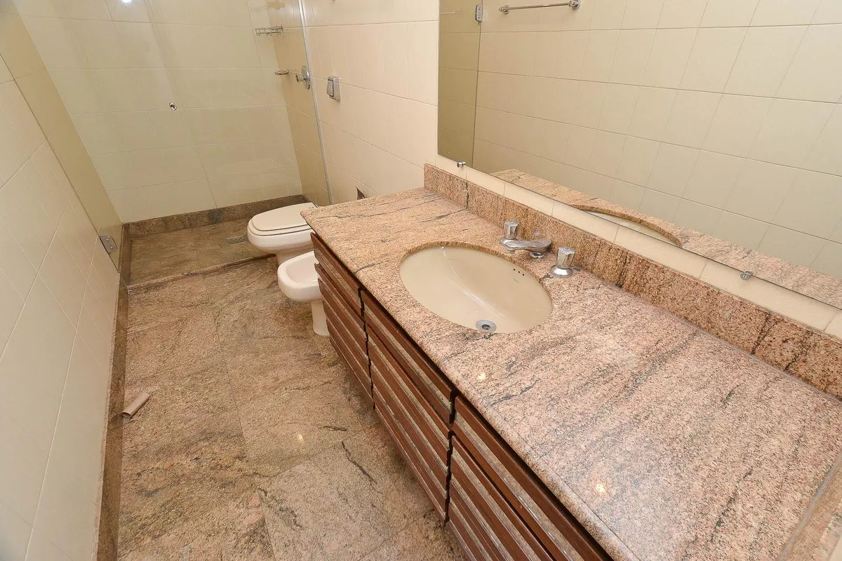 Apartamento com área de 300m², sala ampla para 02 ambientes com piso em tábua corrida de madeira, teto com rebaixamento em gesso, iluminação planejada e varanda com piso em ardósia, sala de jantar ampla com piso em tábua corrida de madeira, teto com rebaixamento em gesso e iluminação planejada, lavabo com bancada em granito, 04 quartos amplos, todos com piso em tábua corrida e armários, sendo 02 suítes com bancada em granito, espelho, armários planejados, bidê e box em blindex, banheiro social com bancada em granito, espelho, armários planejados, bidê e banheira, cozinha ampla com piso e bancada em formato de L em granito e armários planejados, área de serviço e banho de serviço.