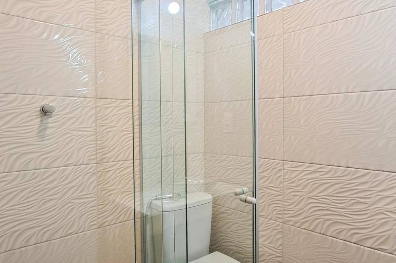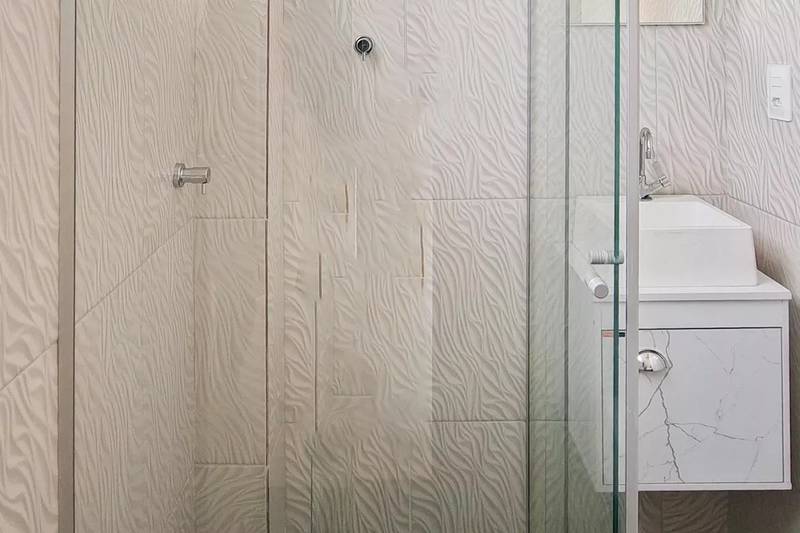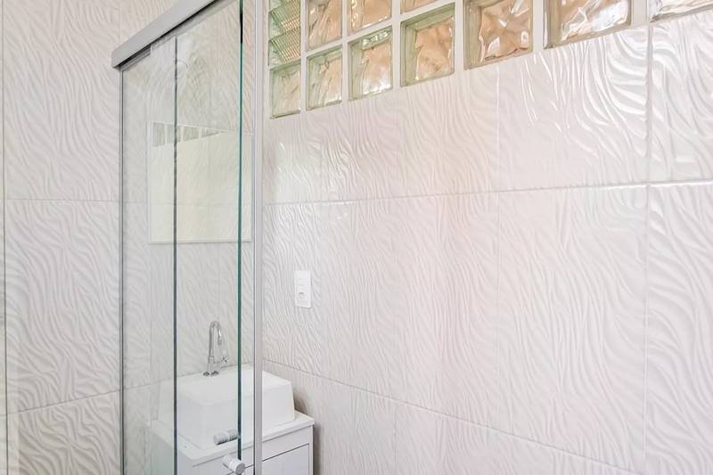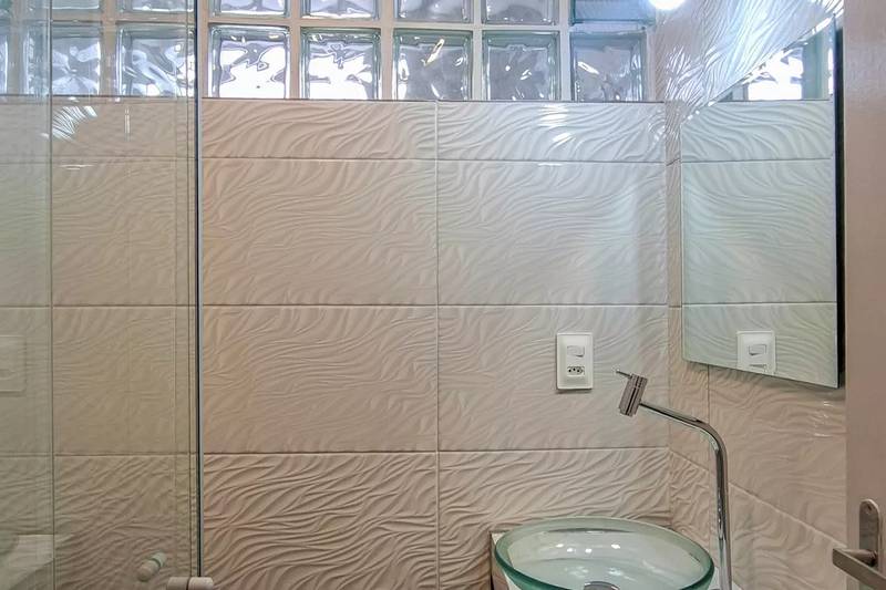 Banheiro social com bancada em granito, espelho, pia em cuba de apoio e box em blindex