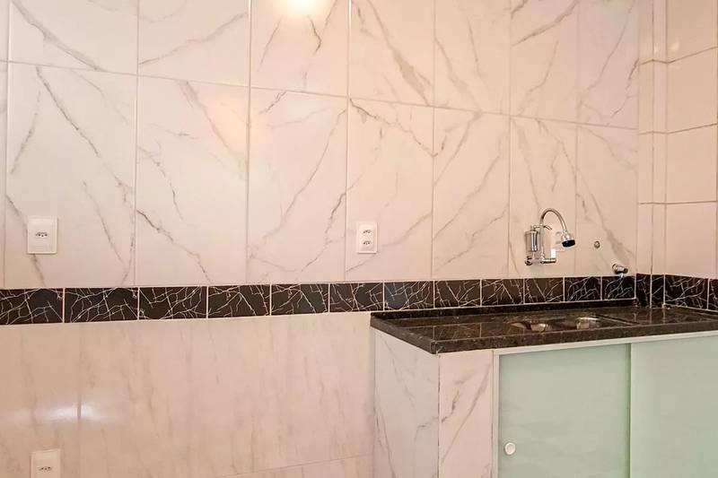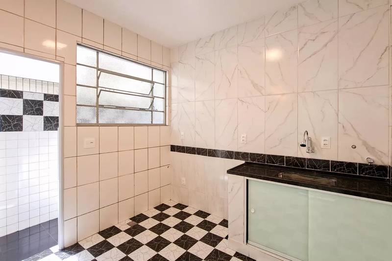 Cozinha ampla com bancada em granito, revestimento completo em cerâmica e armários