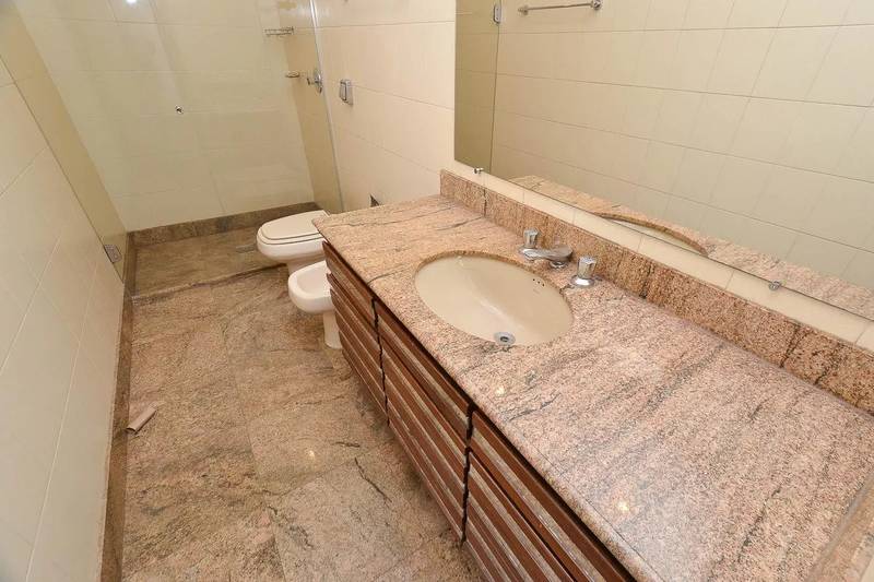 Banheiro social com bancada em granito, espelho, armários planejados, bidê e banheira