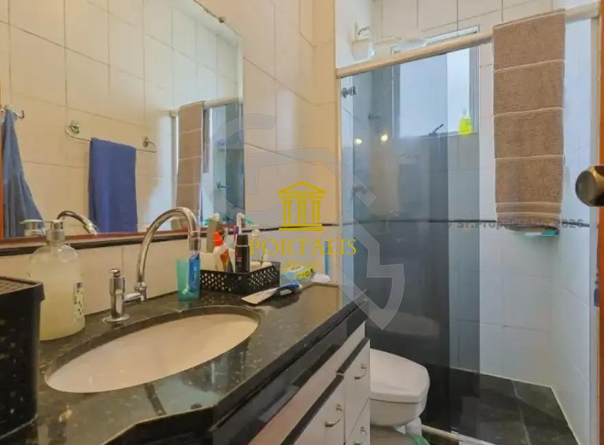 Banheiro social com bancada em granito, armário, espelho e box em blindex